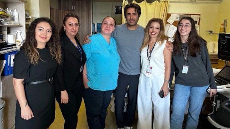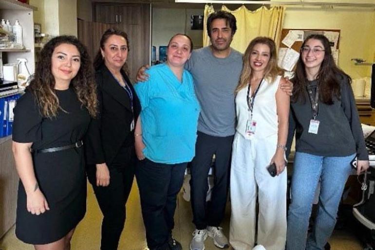 Kardiyoloji kısmına başvuran sanatçı, hastaneden çıkmadan evvel sıhhat çalışanlarının da hatıra fotoğrafı isteğini geri çevirmedi.