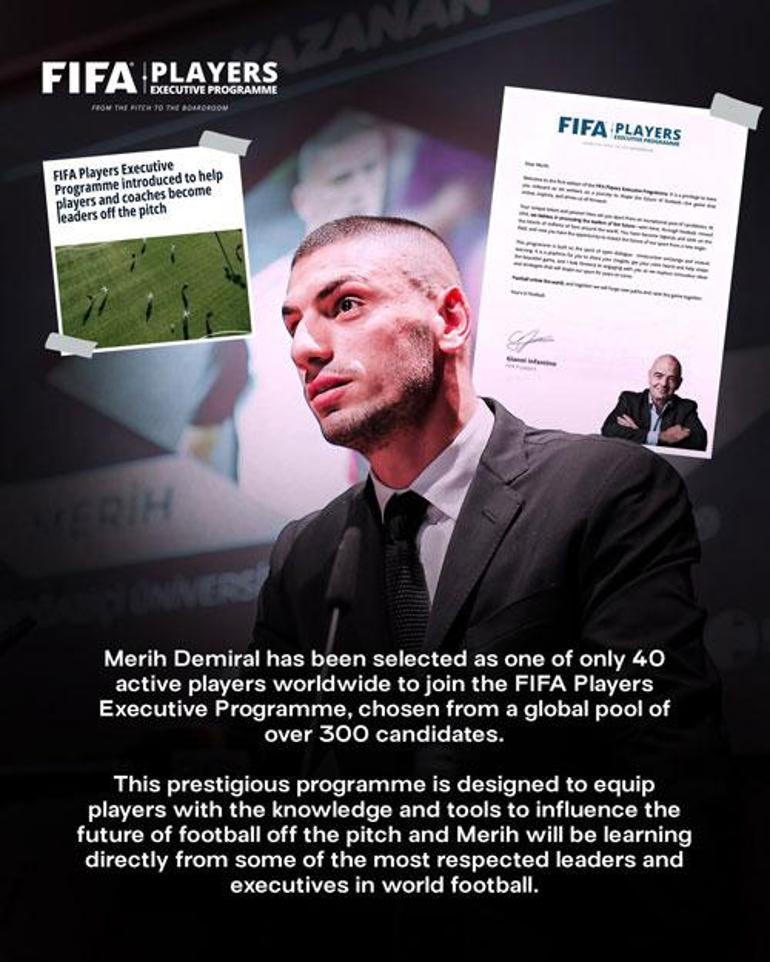 Milli futbolcu Merih Demiral, FIFA’nın hayata geçirdiği ve dünya çapında yalnızca 40 futbolcunun yer aldığı FIFA Players Executive Programme’a kabul edilen birinci Türk futbolcu oldu. Merih Demiral, Demirören Haber Ajansı’na (DHA) yaptığı açıklamada, “Türk bayrağını yalnızca alanda değil, futbolun karar verici sistemlerinde da temsil edebilmek değerli ve bunu çok istiyorum. Bunun eksikliği vakit zaman hem kulüplerimizin hem de futbolcularımızın hissettiği bir şey. Gelecekte bu noktalardaki eksikliklerimizi gidermek için bu ve gibisi eğitimler çok değerli rol oynuyor” dedi.