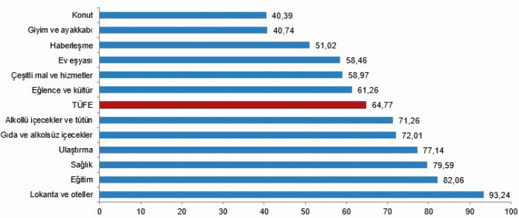 Bir önceki yılın aynı ayına göre en az artış gösteren ana grup yüzde 40,39 ile konut oldu. Buna karşılık, bir önceki yılın aynı ayına göre artışın en yüksek olduğu ana grup ise yüzde 93,24 ile lokanta ve oteller oldu.