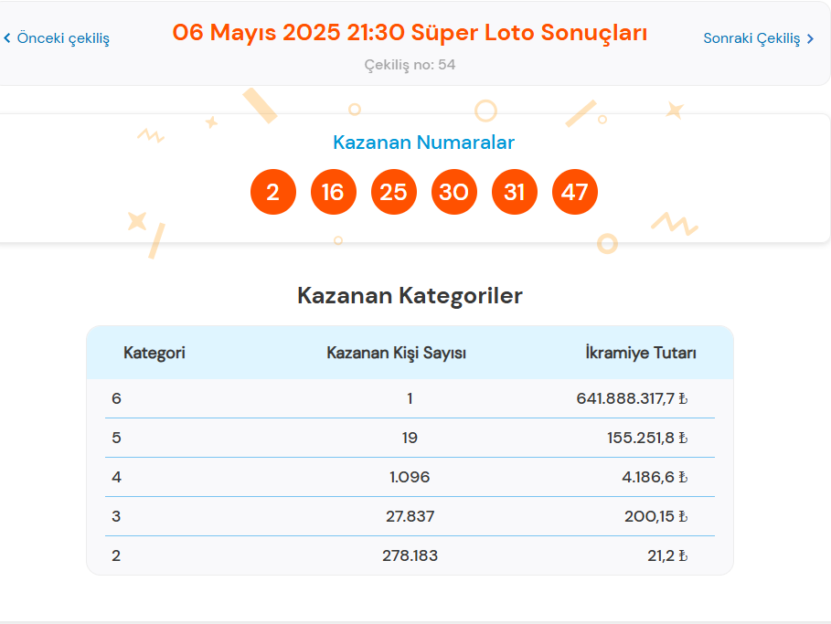 Süper Loto’nun 6 Mayıs 2025 tarihinde gerçekleşen çekilişinde, 6 bilen 1 talihli 641.888.317,7 TL’lik büyük ikramiyenin sahibi oldu.
