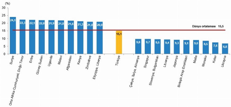 Birleşmiş Milletler dünya nüfus tahminlerine göre ülkelerin toplam nüfusları içindeki 15-24 yaş grubu genç nüfus oranları incelendiğinde, 2023 yılında en yüksek genç nüfus oranına sahip olan ülke, yüzde 24,1 ile Suriye oldu. Bu ülkeyi yüzde 22,3 ile Orta Afrika Cumhuriyeti ve Doğu Timor, yüzde 22,1 ile Eritre izledi. Genç nüfus oranının en düşük olduğu ülke, yüzde 6,8 ile Ukrayna oldu. Bu ülkeyi yüzde 7,6 ile Katar, yüzde 8,5 ile Monako izledi. Genç nüfus oranı dünya ortalaması, 2023 yılında ,5 oldu. Türkiye’nin genç nüfus oranın ,1 ile dünya genç nüfus ortalamasının hemen altında olduğu görüldü.