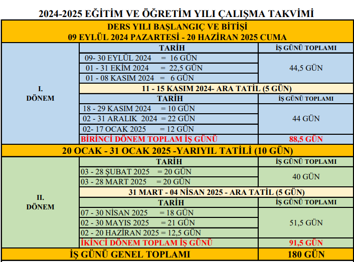 Bakanlığımızca “2024-2025 Eğitim Öğretim Yılı Takvimi”, 28 Mayıs 2024 tarihinde kamuoyuyla paylaşılmış ve eğitim öğretim süreçleri, açıklanan takvim doğrultusunda devam etmektedir.