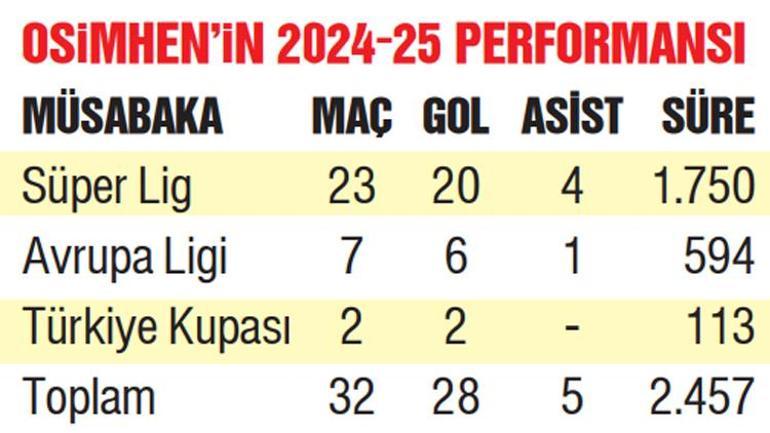 Osimhen bu dönem sarı kırmızılılarda 23’ü ligde, 7’si Avrupa Ligi’nde 2’si de Türkiye Kupası’nda olmak üzere çıktığı 32 maçta toplamda 28 kere ağları havalandırdı. Ligde krallık yarışının doruğunda yer alan 26 yaşındaki futbolcu performansının yanı sıra azmi, aidiyeti ve hırsıyla taraftarların gönlünde taht kurdu.