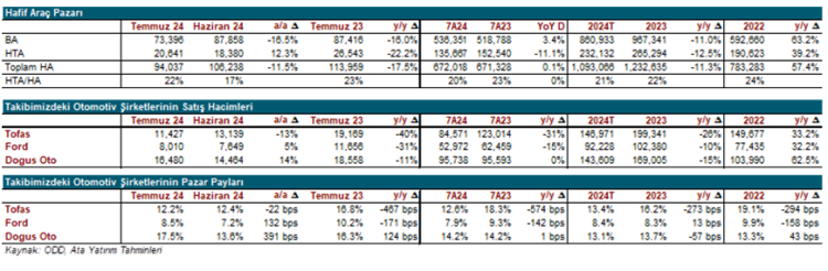 Borsa piyasalarının takibinde yer alan Dogus Otomotiv ve Ford Otosan aylık bazda (aylık 391 baz puan artışla yüzde 17,5 ve aylık 132 baz puan artış yüzde 8,5) pazar payı kazanırken, Tofaş (aylık 22 baz puan azalışla yüzde 12,2) pazar payı kaybetmiştir. Temmuz 2024’te Dogus Otomotiv pazar payı lideriyken onu Tofas izlemiştir. Aynı dönemde Stellantis Otomotiv (Peugeot, Citroen, DS ve Opel) yüzde 15,6 pazar payı bulunmaktadır.