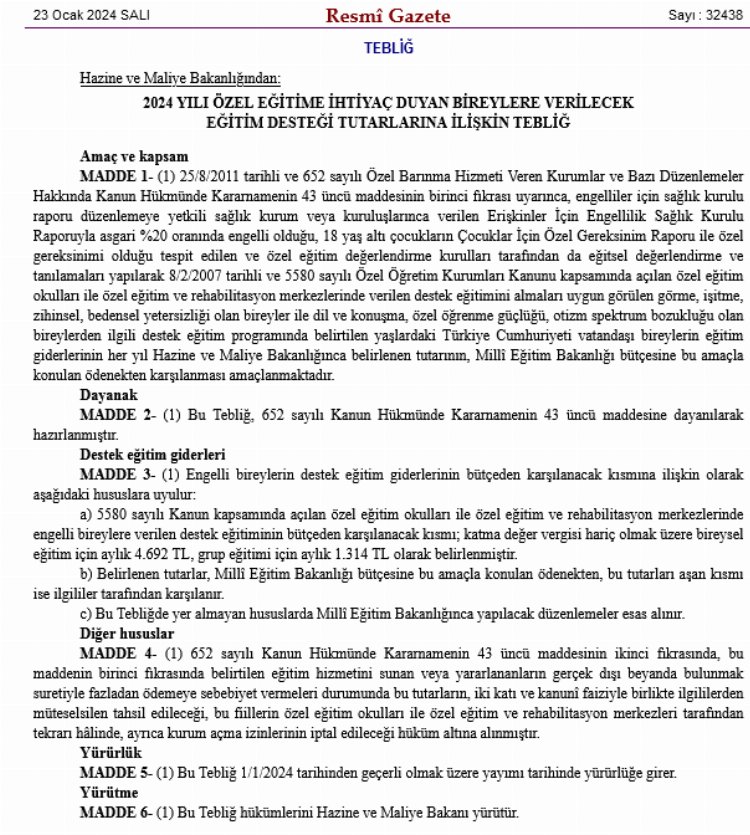 Hazine ve Maliye Bakanlığı, 2024 yılı özel eğitime ihtiyaç duyan bireylere verilecek eğitim desteği tutarlarına ilişkin tebliği bugün Resmi Gazete’de yayımladı.