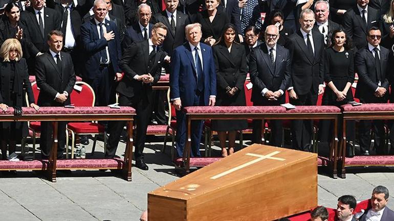 Papa Francis’in cenaze merasiminin en ön sırasında Donald Trump ve eşi Melania Trump, Estonya Cumhurbaşkanı Karis, İspanya Hükümdarı 6. Felipe ve İspanya Kraliçesi Letizia ve Macron yer aldı.