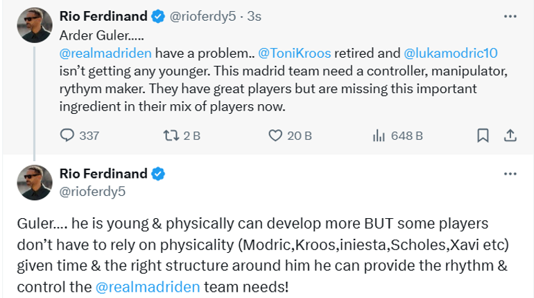 A Ulusal Futbol Takımı’mızın ve Real Madrid’in yıldızı Arda Güler’e, Manchester United ve İngiliz futbolunun efsane ismi Rio Ferdinand sahip çıktı.