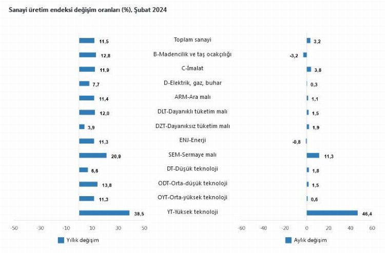Buna göre sanayinin alt sektörleri incelendiğinde, 2024 yılı Şubat ayında madencilik ve taş ocakçılığı sektörü endeksi bir önceki yılın aynı ayına göre yüzde 12,8 artarken, imalat sanayi sektörü endeksi yüzde 11,9 arttı ve elektrik, gaz, buhar ve iklimlendirme üretimi ve dağıtımı sektörü endeksi yüzde 7,7 artış kaydetti.