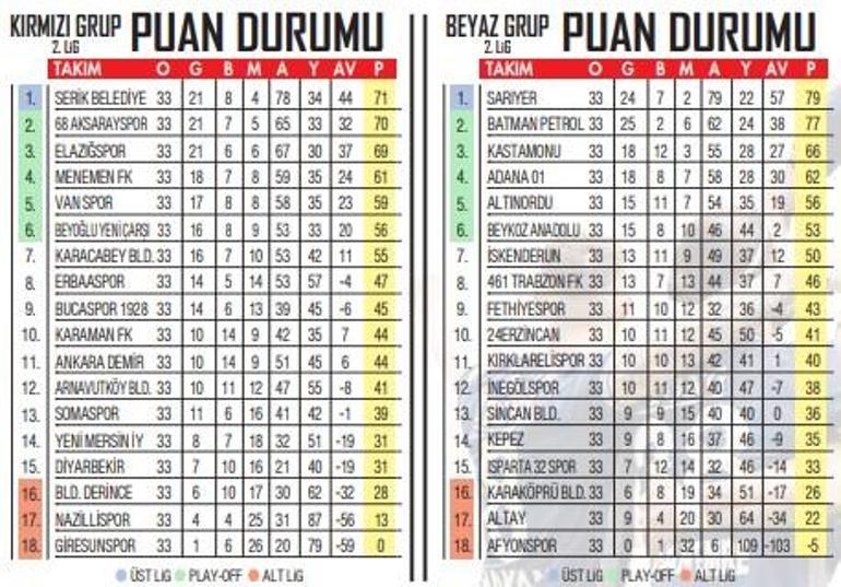 Beyaz Grup’ta son haftaya Batman Petrolspor’un 2 puan önünde önder giren Sarıyer, bugün İskenderunspor’a konuk olacak. Sarıyer, en az 1 puan alırsa ismini 1. Lig’e yazdıracak. Kırmızı Grup’ta 71 puanlı başkan Serik Belediyespor’u, 70 puanlı 68 Aksaray takip ediyor.