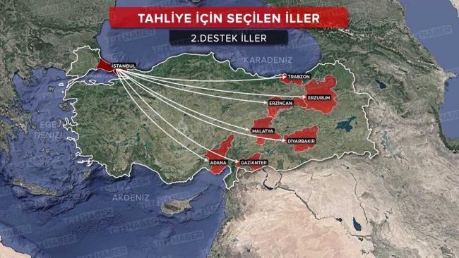 İhtiyaca bağlı ikinci küme dayanak vilayet olarak belirlenen Adana, Gaziantep, Malatya, Trabzon, Diyarbakır, Erzurum ve Erzincan’a da depremzedeler sevk edilebilecek.