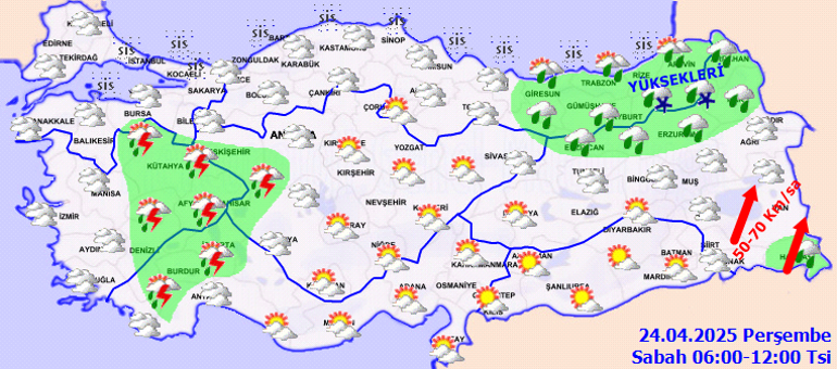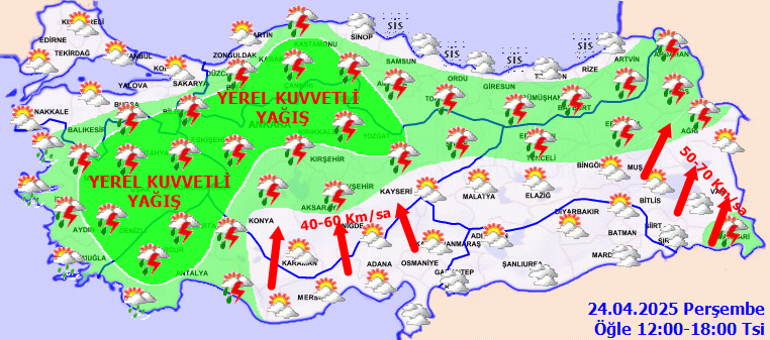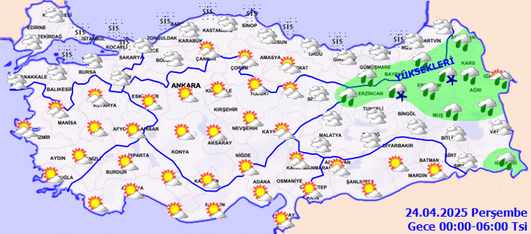 Meteoroloji Genel Müdürlüğü tarafından yapılan iddialara nazaran, ülkemiz genelinin kesimli ve çok bulutlu, Marmara’nın güneydoğusu, Ege, Batı Akdeniz, (Karaman hariç) İç Anadolu, Batı ve Orta Karadeniz’in iç kısımları, Doğu Karadeniz, Doğu Anadolu’nun kuzey ve doğusunun mahallî sağanak ve gök gürültülü sağanak yağışlı geçeceği kestirim ediliyor. Yağışların İç Ege, Batı Akdeniz ve Batı Karadeniz’in iç bölümleri, İç Anadolu’nun kuzey ve batısında mahallî kuvvetli olması bekleniyor. Marmara’nın kuzeyi ile Karadeniz kıyılarında pus ve yer yer sis görüleceği kestirim ediliyor.