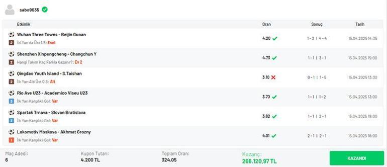 Misli üyesi, 6 maçtan oluşan bir sistem kuponu yaptı. Çin Üstün Ligi’nde oynanan Shenzhen Xinpengcheng – Changchun Y. Müsabakası için Ev Sahibi 2 Farkla Kazanır varsayımında bulundu. Yudong Zhang’ın golüyle öne geçen Shenzhen’e cevap 20. dakikada geldi. Changchun’da Long Tan skoru eşitledi. Misli üyesi bu gol sonrası mesken sahibinin 2 farklı galibiyeti için bekleyişe geçti. Birinci yarının 1-1’lik eşitlikle sona ermesinin akabinde ikinci yarıda gol için ataklarını gerçekleştiren Sichuan, 56’da Eduardo Garcia Martin’in golüyle tekrar öne geçti. Rakip kalede tesirini sürdüren Sichuan, 65’te bulduğu golle farkı 2’ye çıkardı. Misli üyesi istediği skoru aldı ve bekleyişe geçti. Kalan dakikalarda diğer gol olmayınca kuponun en yüksek oranlı iddiası tutmuş oldu. Misli üyesi böylelikle Ev Sahibi 2 Farkla Kazanır varsayımıyla 4.73’lük oranı bildi.