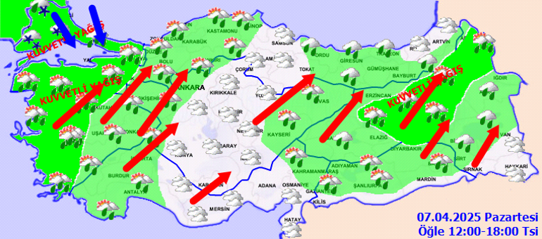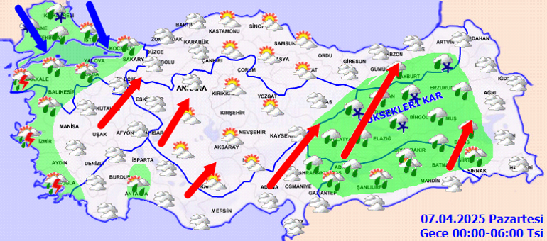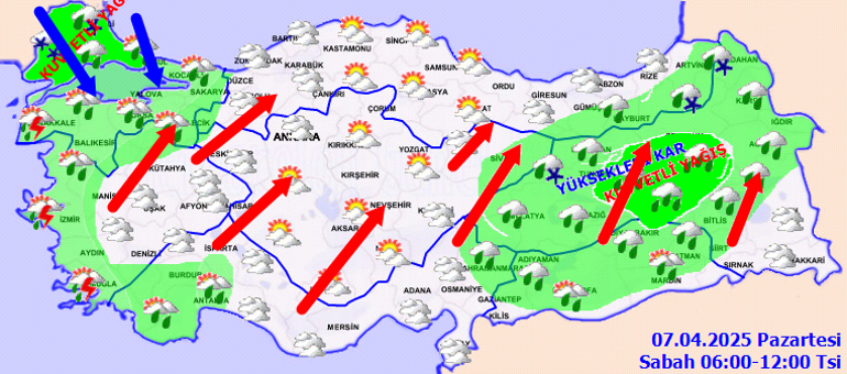 Meteoroloji Genel Müdürlüğü tarafından yapılan kestirimlere nazaran, ülkemiz genelinin kesimli ve çok bulutlu, Marmara, Ege, Batı Akdeniz, Batı Karadeniz, Doğu Karadeniz’in iç bölümleri, (Şırnak ve Hakkari haric) Doğu Anadolu, (Madin haric) Güneydoğu Anadolu ile Ankara, Eskişehir, Osmaniye, Nevşehir, Sivas, Kayseri, Ordu, Giresun ve Trabzon etraflarının aralıklı yağışlı geçeceği varsayım ediliyor. Trakya ile Doğu Anadolu’nun kuzeyinin yüksek kısımlarında karla karışık yağmur ve kar; yağış alan öbür yerlerde yağmur ve sağanak formunda görülmesi beklenen yağışların Marmara, Kıyı Ege, Manisa, Ardahan, Kars, Erzurum, Tunceli, Muş, Bingöl etraflarında lokal kuvvetli olması bekleniyor. Rüzgarın, Marmara’da kuzey ve kuzeydoğu, Ege ve Akdeniz’in iç kesitleri, İç Anadolu’nun güney ve doğusu, Karadeniz’in iç kesitleri, Doğu Anadolu ile Güneydoğu Anadolu’nun kuzeyinde güney ve güneybatı istikametlerden kuvvetli ve kısa vadeli fırtına (40-70 km/sa) formunda eseceği varsayım ediliyor.