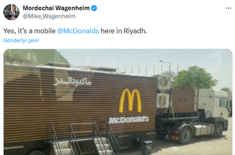 Cumhuriyetçilere yakın siyaset uzmanı Benny Johnson, X platformundan yaptığı paylaşımda, “Suudi Arabistan, Lider Trump’ın ziyareti için özel olarak taşınabilir McDonald’s getirdi” açıklamasını yaptı. Platformda viral olan öteki paylaşımlarda ise toplumsal medya kullanıcıları bu sahneyi “inanılmaz” diye tanımladı.