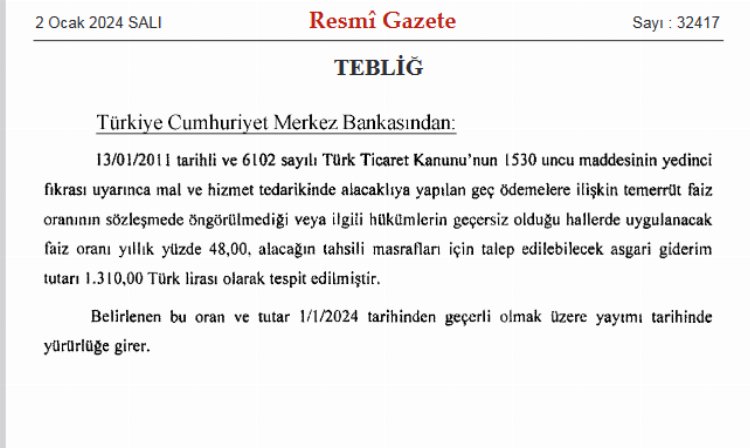 Buna göre mal ve hizmet tedarikinde alacaklıya yapılan geç ödemelere ilişkin temerrüt faiz oranının sözleşmede öngörülmediği veya ilgili hükümlerin geçersiz olduğu hallerde uygulanacak faiz oranı yıllık yüzde 48, alacağın tahsili masrafları için talep edilebilecek asgari giderim tutarının bin 310 TL olması kararlaştırıldı.