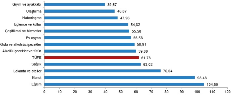 Bir önceki yılın aynı ayına göre en az artış gösteren ana grup yüzde 39,57 ile giyim ve ayakkabı olurken, buna karşılık, bir önceki yılın aynı ayına göre artışın en yüksek olduğu ana grup ise yüzde 104,50 ile eğitim oldu.