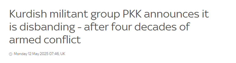 “PKK, Türkiye ile 40 yılı aşkın müddetin akabinde silah bırakma kararı aldı. Pazartesi günü yapılan açıklamada, PKK’nın kendini feshetme ve silahlı faaliyetlerine son verme kararı aldığı bildirildi.