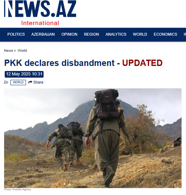 Azerbaycanlı News AZ ise PKK’nın bu hafta düzenlediği kongrede aldığı kararı resmen duyurduğunu haberleştirdi. Haberde, örgütün bugün yaptığı açıklamada silahlı atakları sonlandırma ve dağılma kararı aldığı bildirildi.