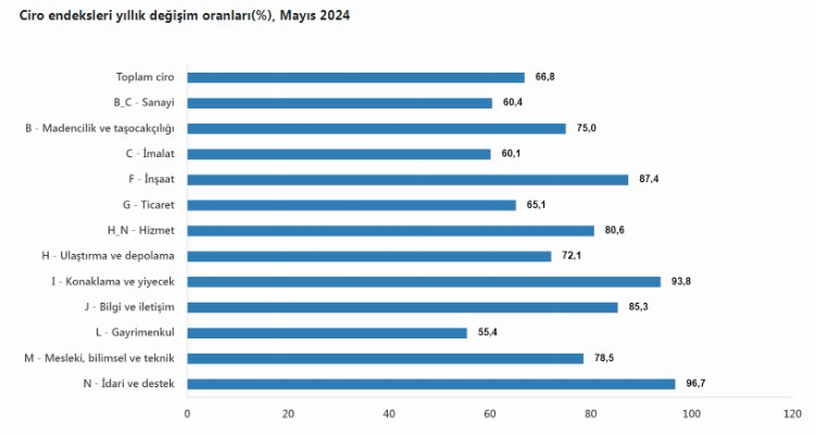 Sanayi, inşaat, ticaret ve hizmet sektörleri toplamında ciro endeksi (2021=100), 2024 yılı Mayıs ayında yıllık yüzde 66,8 oranında artış gösterirken; toplam cironun alt detaylarına bakıldığında 2024 yılı Mayıs ayında yıllık sanayi sektörü ciro endeksi yüzde 60,4 arttı, inşaat ciro endeksi yüzde 87,4 arttı, ticaret ciro endeksi yüzde 65,1 arttı, hizmet ciro endeksi yüzde 80,6 arttı.