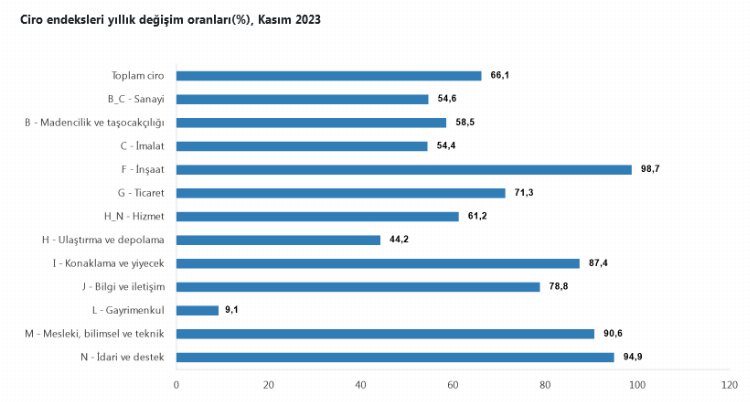 Buna göre toplam cironun alt detaylarına bakıldığında; 2023 yılı Kasım ayında yıllık sanayi sektörü ciro endeksi yüzde 54,6 arttı, inşaat ciro endeksi yüzde 98,7 arttı, ticaret ciro endeksi yüzde 71,3 arttı, hizmet ciro endeksi yüzde 61,2 arttı.