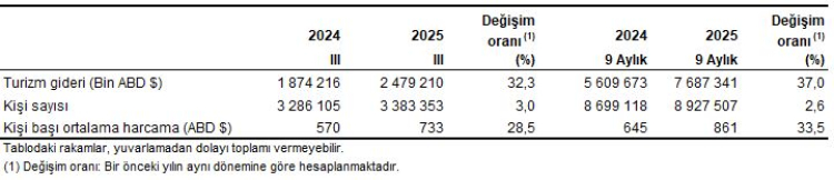 Yurt dışına çıkan Türk vatandaşlarının turizm gideri yüzde 32,3 artarak 2 milyar 479 milyon dolara yükseldi. Bu dönemde 3 milyon 383 bin kişi yurt dışına çıktı ve kişi başına ortalama 733 dolar harcama yaptı.