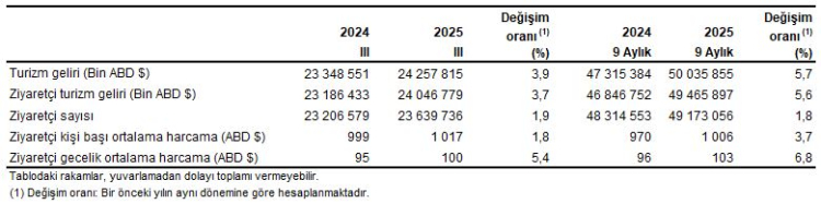 – Türkiye İstatistik Kurumu (TÜİK), 2025 yılının üçüncü çeyreğine (Temmuz–Eylül dönemi) ilişkin turizm istatistiklerini açıkladı. Buna göre, turizm geliri geçen yılın aynı dönemine göre yüzde 3,9 artarak 24 milyar 257 milyon 815 bin dolar olarak gerçekleşti.