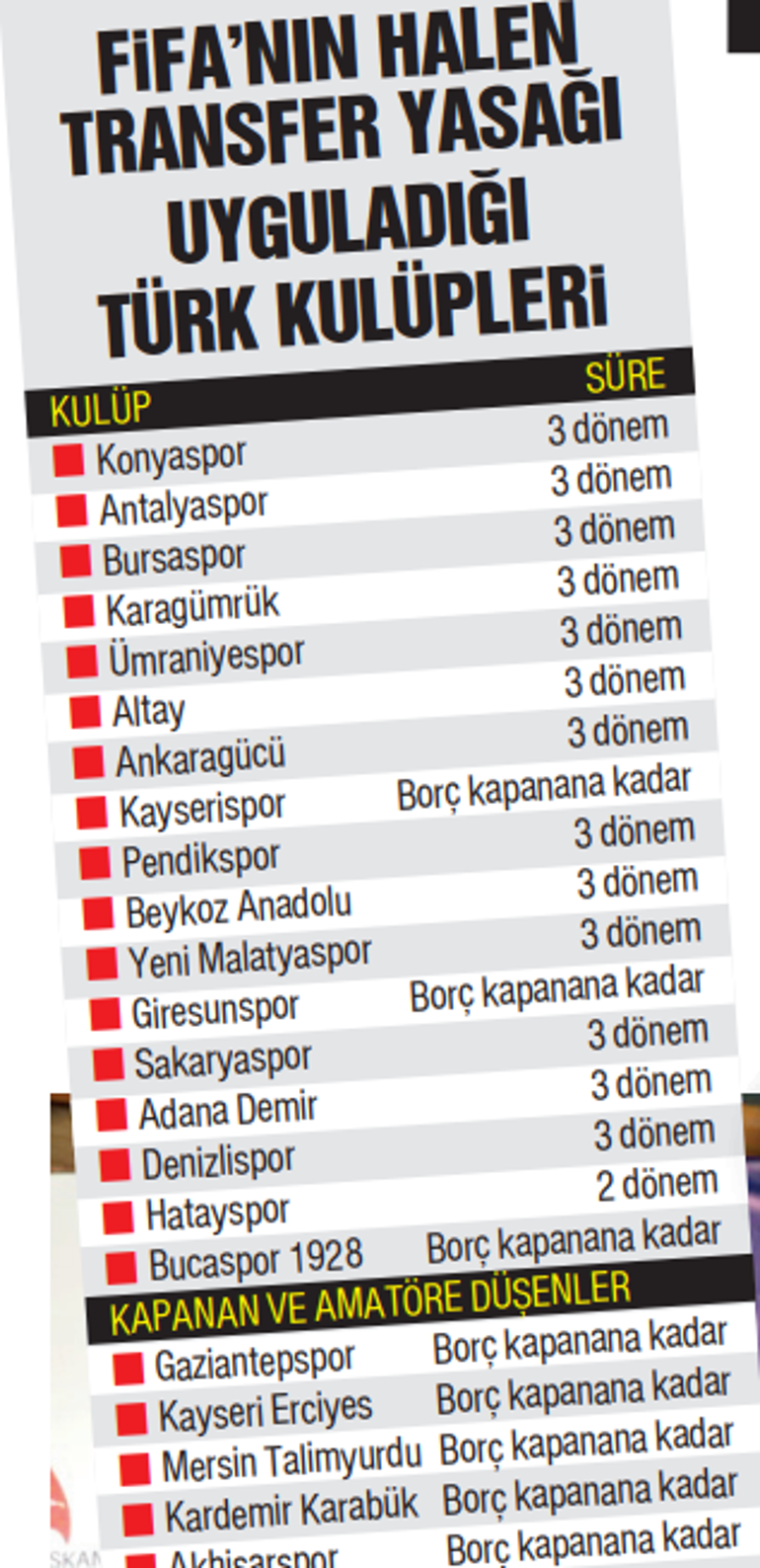 FiFA, nisan ayı içinde Konyaspor, Antalyaspor, Ankaragücü, Karagümrük, Ümraniyespor, Bursaspor ve Altay’a 3’er devir, Kayserispor’a da borç ödeninceye kadar transfer yasağı cezası verdi. Ortalarında kapatılan ya da amatöre düşenler de dahil toplam 22 Türk kulübünün transfer yasağı cezaları devam ediyor.FiFA, nisan ayı içinde Konyaspor, Antalyaspor, Ankaragücü, Karagümrük, Ümraniyespor, Bursaspor ve Altay’a 3’er periyot, Kayserispor’a da borç ödeninceye kadar transfer yasağı cezası verdi. Ortalarında kapatılan ya da amatöre düşenler de dahil toplam 22 Türk kulübünün transfer yasağı cezaları devam ediyor.