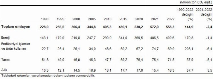 32 yıllık verilerde sera gazı envanteri sonuçlarına göre, 2022 yılı toplam sera gazı emisyonu bir önceki yıla göre yüzde 2,4 azalarak 558,3 milyon ton (Mt) CO2 eşdeğeri (eşd.) olarak hesaplandı. Kişi başı toplam sera gazı emisyonu 1990 yılında 4,1 ton CO2 eşd., 2021 yılında 6,8 ton CO2 eşd. ve 2022 yılında 6,6 ton CO2 eşd. olarak hesaplandı.