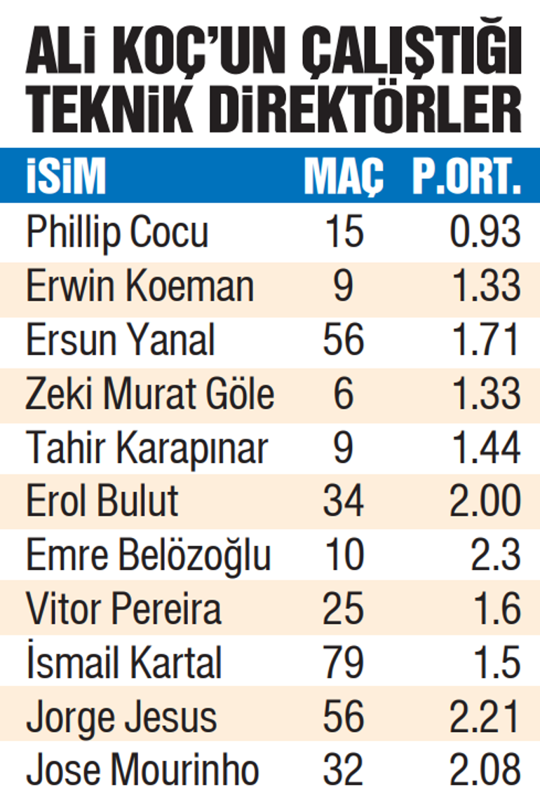 Ali Koç, teknik yöneticide de istikrarı yakalayamadı. Hala ekibin başında bulunan ve misyonuna devam edip etmeyeceği tartışma konusu olan Jose Mourinho, Koç’un 11. teknik yöneticisi. 3 Portekizli (Mourinho, Jesus, Pereira) ve 2 Hollandalı (Cocu, Erwin Koeman) ile çalışan Ali Koç, 6 da yerli iisim kadronun başına getirdi (Ersun Yanal, Zeki Murat Göle, Tahir Karapınar, Emre Belözoğlu, Erol Bulut, İsmail Kartal). Bu isimler ortasında maç başı en yüksek puan ortalamasını Emre Belözoğlu (2.3) yakalarken, en başarısız isim Cocu oldu (0.93).