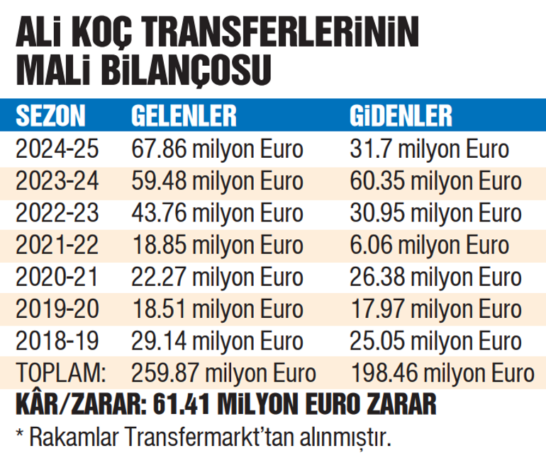 · Son 7 yılda transfer edilen oyuncuların bonservis ve kiralama bedellerinin toplam fiyatı 259.87 milyon Euro.