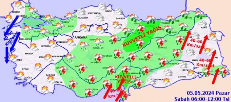 Buna göre kuvvetli yağışların Doğu Akdeniz, Doğu Karadeniz, Doğu Anadolu’nun kuzeybatısı, Sivas, Ordu, Muş, Bitlis, Şırnak, Siirt ve Batman ile Diyarbakır’ın doğu, Erzurum’un batı çevrelerinde yerel kuvvetli olması beklendiği, kuvvetli rüzgarın ise Kuzey Ege kıyılarında kuzey ve kuzeydoğudan, Doğu Akdeniz ile Doğu Anadolu’nun doğusunda güney ve güneybatıdan kuvvetli esmesi beklendiğinden yaşanabilecek olumsuzluklara karşı dikkatli ve tedbirli olunması istendi.