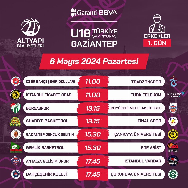 2023-2024 Sezonu altyapı faaliyetleri kapsamında 6-12 Mayıs 2024 tarihleri arasında düzenlenecek U18 Erkekler Türkiye Şampiyonası Gaziantep’te başlıyor.
