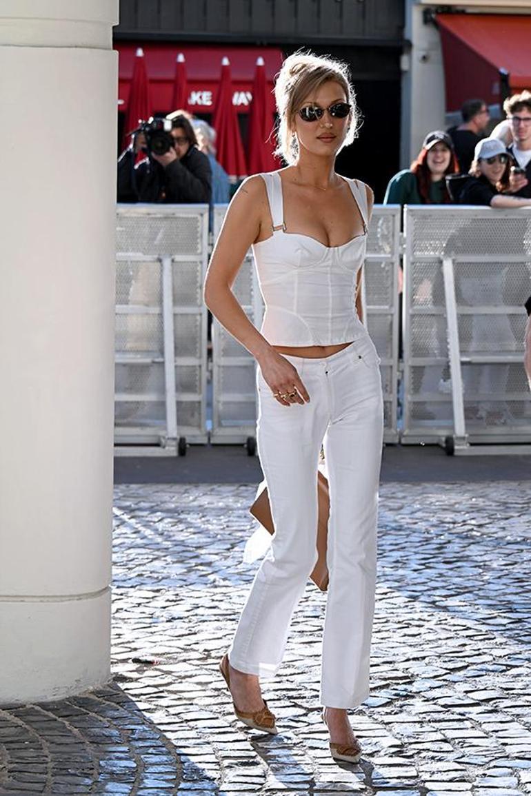 28 yaşındaki Hadid dağınık formda topladığı sarı saçlarıyla herkesin ilgi odağı oldu. Bella Hadid şenliğe beyaz, kalın askılı korsaj tipi bir üst ve beyaz pantolonla geldi.
