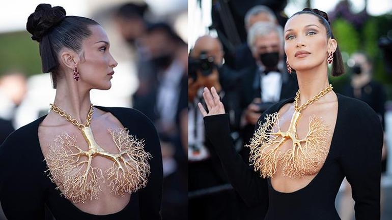 Hadid Cannes’ın en konuşulan ismi olmayı 2021’de de sürdürmüş bu defa de göğüs kısmında altın görünümlü 3 boyutlu akciğer halinde bir kesim eklenmiş Schiaparelli tasarımı elbisesiyle isminden kelam ettirmişti.