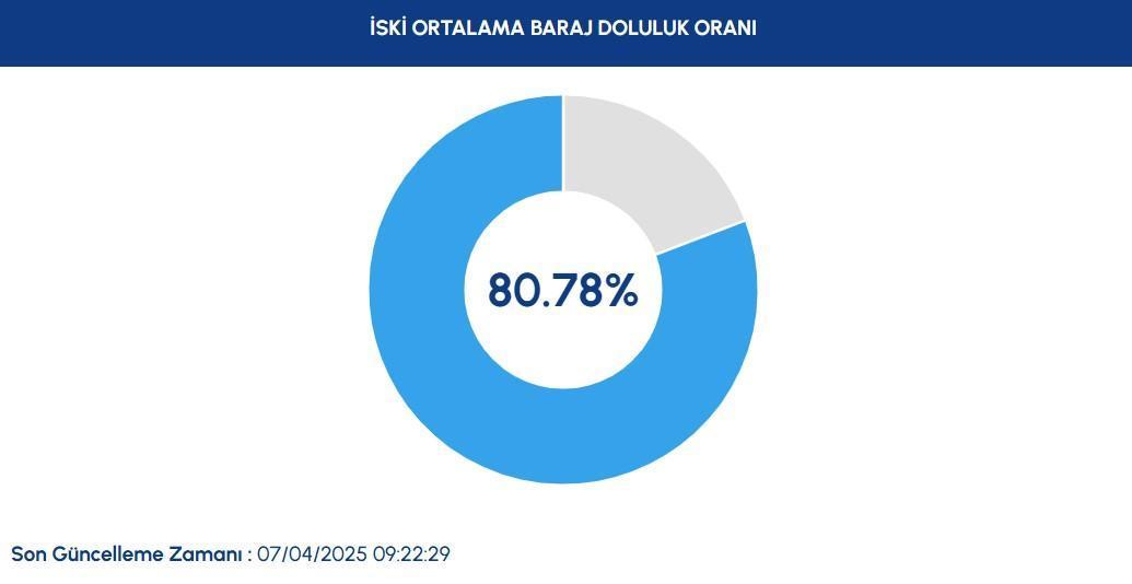 İstanbul Su ve Kanalizasyon İdaresi Genel Müdürlüğü (İSKİ) bilgilerine nazaran, barajlardaki su düzeyinde son bir haftada artış görüldü. Barajlardaki doluluk oranı 7 Nisan 2025 prestijiyle yüzde 80,78 oldu.