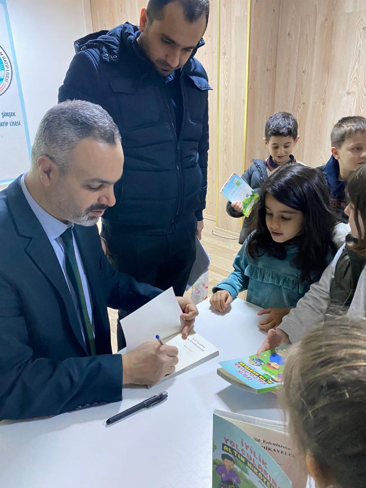 Özmen, konferansın sonunda okul öğrencilerine “İyilik Yolcularına Altın Hikayeler” kitabını imzaladı.