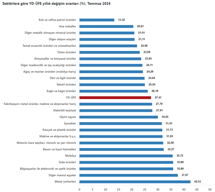 YD-ÜFE 2024 yılı Temmuz ayında bir önceki aya göre yüzde 1,70 artış, bir önceki yılın Aralık ayına göre yüzde 17,17 artış, bir önceki yılın aynı ayına göre yüzde 27,41 artış ve 12 aylık ortalamalara göre yüzde 55,80 artış gösterdi.