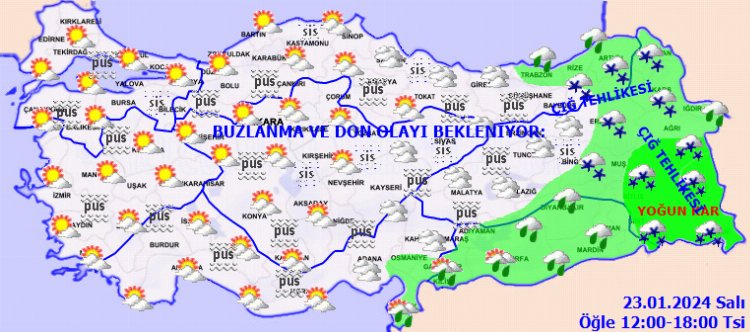 KUVVETLİ VE YOĞU KAR YAĞIŞI UYARISI :Kar yağışlarının; Kars, Ardahan ve Ağrı ile kuzey ve doğu ilçeleri başta olmak üzere Erzurum çevreleri ve Muş’un yükseklerinde kuvvetli (10-20 cm), Bitlis, Van’ın kuzey ve güney ilçeleri, Siirt’in yüksekleri, Şırnak’ın doğusunun yüksekleri ile yüksek kesimleri başta olmak üzere Hakkari’de yer yer yoğun (20 cm üzeri) karla karışık yağmur ve kar şeklinde olması beklendiğinden ulaşımda aksamalar, buzlanma ve don, çığ, tipi gibi olumsuzluklara karşı dikkatli ve tedbirli olunması gerekmektedir.
